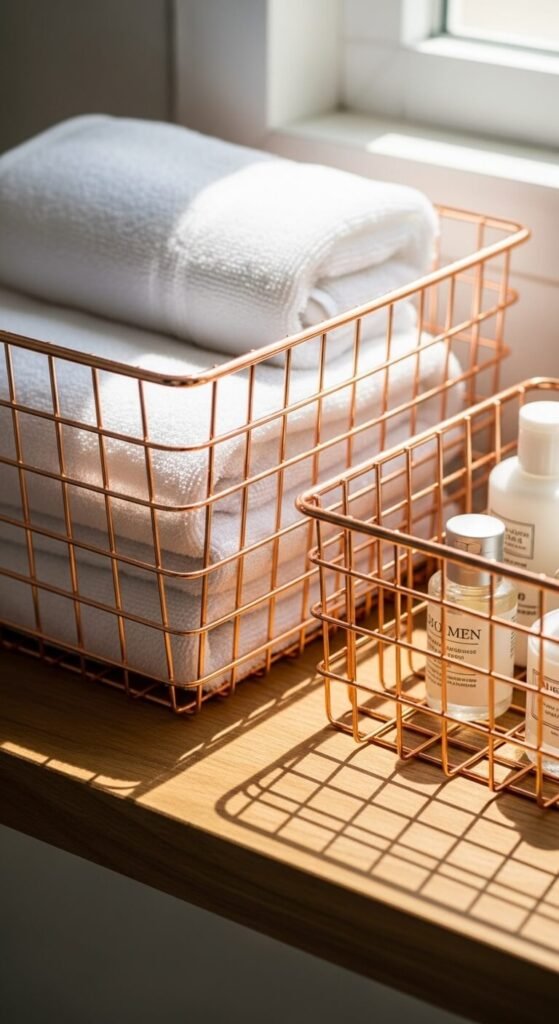 Rose gold wire baskets used for open shelf storage in a bathroom, kitchen, or home office add warm metallic tone to the functional storage layer of a room — they look just as decorative as they are practical and cost almost nothing compared to most decorative rose gold pieces. Rose gold wire baskets cost $8 to $25 each from home organization retailers, IKEA, and Amazon. The open wire construction makes their contents visible, so fold towels neatly and decant toiletries into white bottles for the cleanest appearance within the basket. A pair of rose gold wire baskets on a bathroom shelf creates a warm metallic storage moment that costs $15 to $50 total.