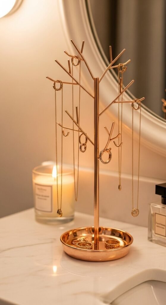 A rose gold jewelry stand — a small tree or tower form with hooks for necklaces, rings, and bracelets — keeps jewelry accessible and visible while functioning as a decorative vanity or bedroom dresser accent that changes in appearance daily as different pieces are hung and removed. A rose gold jewelry tree or tower costs $12 to $30 from most home and accessories retailers. The jewelry displayed on the stand becomes part of the rose gold accent arrangement — the metallic tones of the jewelry and the stand together create a warm metallic surface cluster. Place on a vanity, a dresser, or a bedside table where it is both functional and continuously visible.
