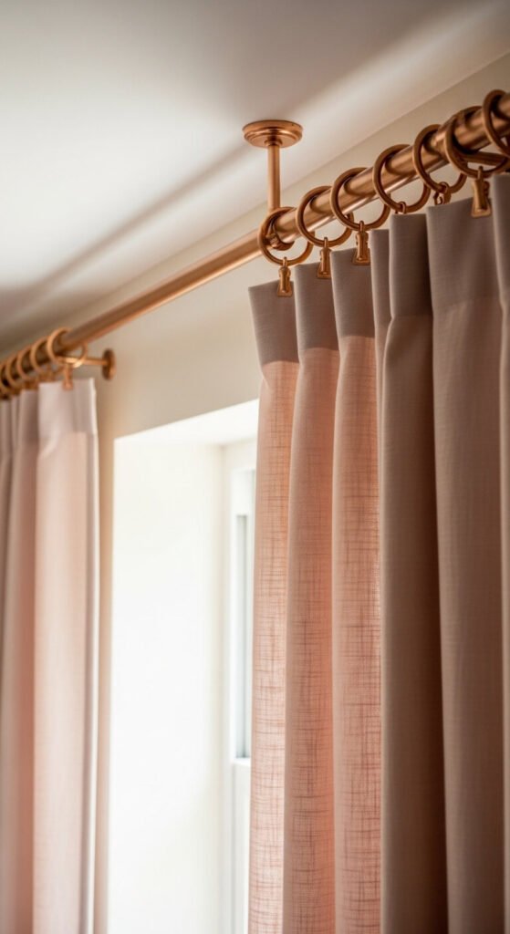 A rose gold curtain pole and ring set adds a warm pink-metallic element to the top of a window in one of the most visually prominent positions in any room — the long horizontal line of the pole runs the full window width and catches light at ceiling height where it is visible from across the room. A rose gold curtain pole kit with rings and finials costs $20 to $60 for a standard window width from most home stores and Amazon. Pair with cream, white, or blush pink curtain panels — the soft warm tones complement rather than compete with the rose gold hardware. Mount the pole at ceiling height regardless of window size for the maximum visual impact.