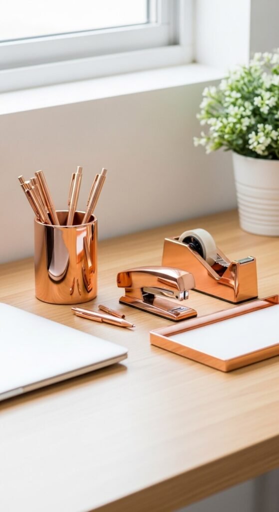 A coordinated rose gold desk accessory set — pen cup, stapler, tape dispenser, and letter tray — creates a warm, styled desk surface that makes working in the home office a slightly more pleasant visual experience. Rose gold desk stationery sets cost $20 to $50 for a four-piece coordinated set from Amazon and most stationery retailers. The key is buying a matched set rather than individual pieces from different product lines — the slight finish variations between unmatched pieces are visible at the close range of a desk. Rose gold desk accessories work especially well on white, light wood, and marble desk surfaces where the warm pink-metallic tone has a clean light background to read against.