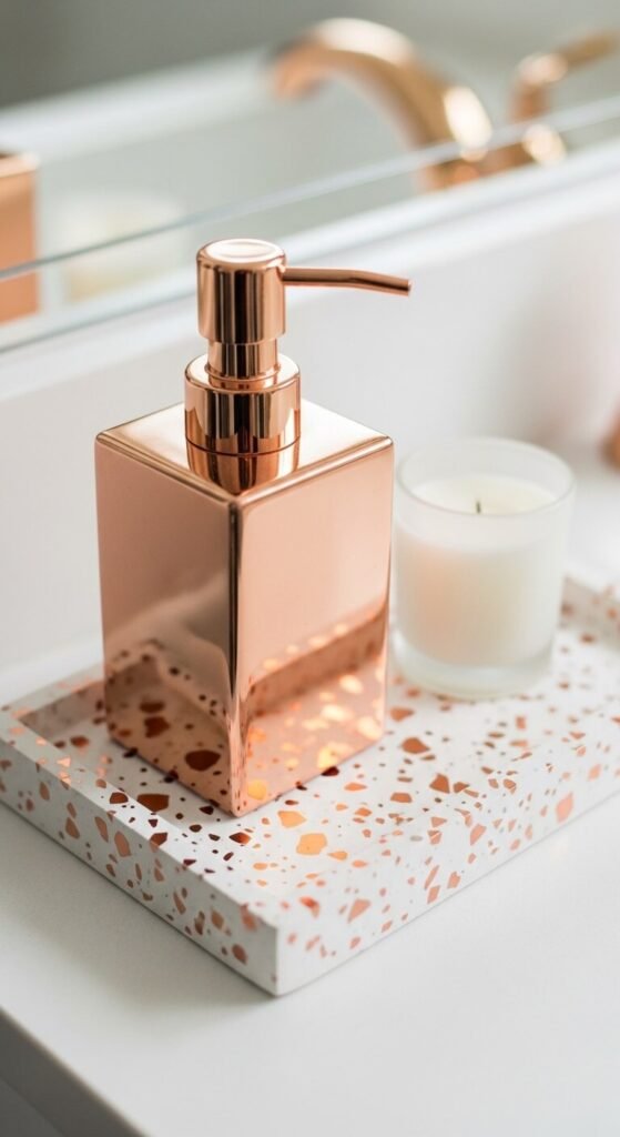 Rose gold accessories combined with terrazzo or marble pieces that contain rose or pink-gold veining create a material pairing where the metallic tone is echoed and reinforced by natural pattern — the effect is more cohesive than placing rose gold against completely unrelated materials. Terrazzo accessories with warm metallic flecks cost $15 to $50 from most contemporary home decor retailers. A terrazzo tray paired with a matching rose gold soap dispenser creates a bathroom counter styling duo where the materials reference each other. White marble with fine warm veining also pairs well with rose gold hardware because the warm veining echoes the pink undertone of the metallic.