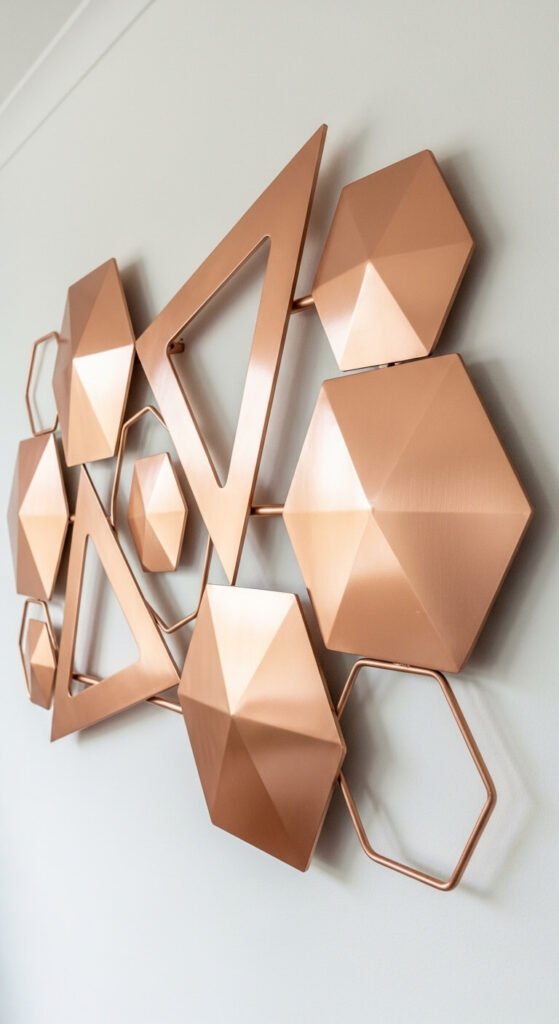 A rose gold geometric metal wall sculpture — a flat or slightly three-dimensional arrangement of angular forms mounted directly on the wall — functions as art while placing rose gold at eye level on the wall itself, which is the most prominent decorative surface in any room. Rose gold metal wall art sculptures cost $30 to $100 from most home decor retailers and Amazon. Choose a piece with some surface dimension rather than a completely flat design — the three-dimensional quality of raised geometric forms creates shadows that change throughout the day as the light angle shifts, giving the piece a constantly varying visual quality. Works best on plain white or pale walls where the rose gold forms have a clean background.