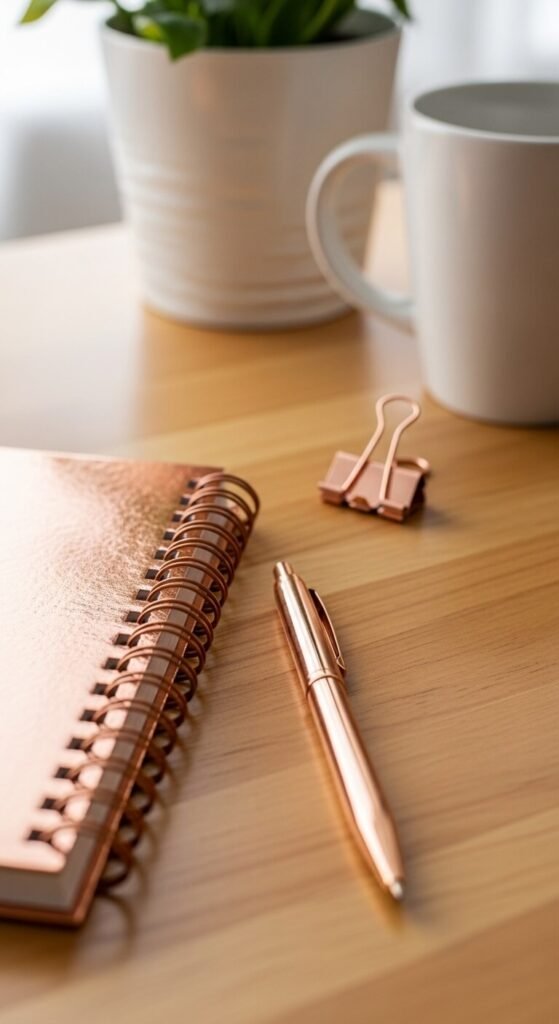 Rose gold stationery — metallic notebooks, pens, and desk accessories — adds warm pink-metallic accents to the desk surface in a form that is used daily and therefore continuously present in the room’s visual field rather than being purely decorative. A rose gold metallic spiral notebook costs $5 to $15 from most stationery and office supply retailers. A rose gold ballpoint or fine-liner pen costs $3 to $12. A rose gold metallic notebook and matching pen together cost $8 to $25 and create a polished desk accessory pairing that looks significantly more expensive than its actual cost. Kikki.K, Paper Republic, and Leuchtturm1917 all produce metallic and rose gold stationery ranges.