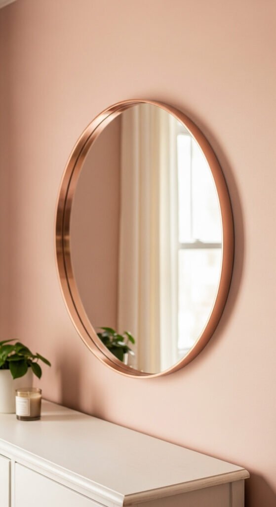 A round mirror in a thin rose gold frame is one of the most widely appealing and broadly compatible rose gold accent pieces — it works in bedrooms, bathrooms, entryways, and living rooms because the circular shape is universally balanced and the thin rose gold frame provides warmth without visual weight. A 24-inch round rose gold mirror costs $30 to $80 from most home decor retailers and Amazon. For a bathroom, choose a mirror rated for humidity exposure. A thrift store mirror in a plain frame can be spray-painted with rose gold metallic spray paint for $5 to $10 — Rust-Oleum Rose Gold Metallic costs $8 and provides a convincing finish on metal and wood frames.