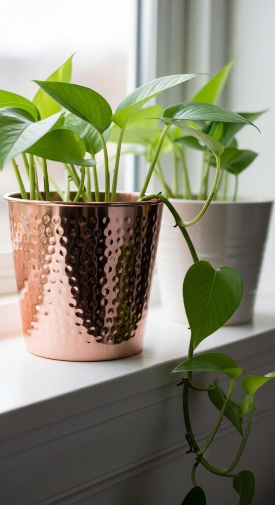 A rose gold metallic plant pot paired with a trailing green plant creates one of the most photographically appealing and lowest-cost rose gold accent combinations available — the warm pink-metallic of the pot and the vivid green of the plant make each other appear more vivid through color contrast. Rose gold metallic plant pots cost $5 to $20 from most garden centers, home stores, and Amazon. Use as a cache pot — place a standard plastic nursery pot inside the rose gold pot rather than planting directly — so the pot can be reused with different plants and watered without damaging the metallic finish. Pothos, tradescantia, and string of pearls are the most trailing-friendly plants for windowsill pot display.