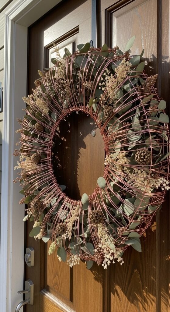A wreath with a rose gold metallic wire base or rose gold ribbon accents creates a warm and welcoming front door decoration that introduces the pink-metallic palette of the home’s interior from the very first impression at the threshold. A handmade wreath on a rose gold metal wire form costs $5 to $15 in materials — a metal wreath ring from a craft store costs $3 to $8 and dried botanical elements cost $5 to $15 for a full wreath. Ready-made rose gold wreaths from Etsy cost $25 to $60. Rose gold ribbon wound through a fresh or dried eucalyptus wreath adds a metallic accent for $3 to $5 in ribbon. Change the botanical content seasonally while keeping the rose gold element constant throughout the year.