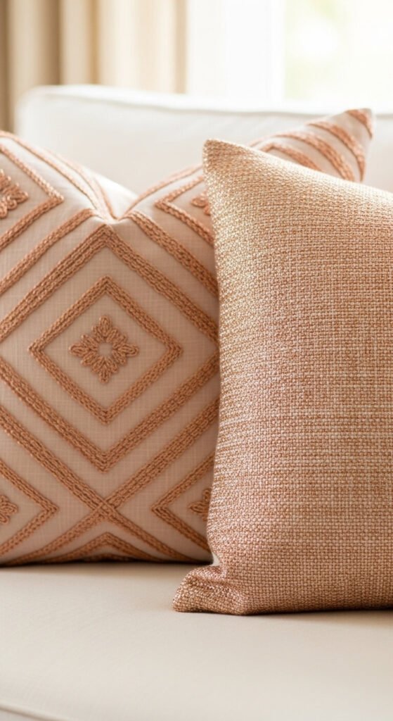 Rose gold metallic fabric or embroidered throw pillows bring the warm pink-metallic tone directly into the soft furnishing layer of a room — the most tactile and most immediately noticed surface in a living room or bedroom — at one of the lowest possible price points for any rose gold accent. A rose gold metallic or embroidered throw pillow costs $15 to $50 from most home decor retailers and Amazon. Use two rose gold pillows together at one end of a sofa alongside plain linen or velvet cushions in blush, cream, or white — the combination of matte soft fabric and warm metallic embroidery is the most appealing tactile contrast available at pillow scale. Replace pillow covers rather than full inserts for the most cost-effective seasonal refresh.