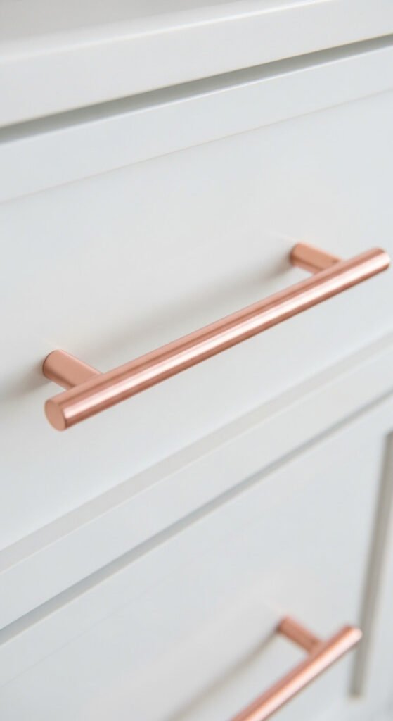 Replacing existing cabinet hardware with rose gold bar pulls or knobs is the fastest rose gold upgrade available — a full bathroom or kitchen cabinet set can be transformed in under an hour with a screwdriver and $20 to $60 in new hardware. Rose gold bar pulls cost $3 to $8 each from Amazon, Etsy, and hardware retailers. A full bathroom vanity of three to four drawer pulls costs $12 to $30. Rose gold hardware on white cabinets creates the most striking contrast — the warm pink-gold against the cool white is the combination most frequently seen in professionally styled bathrooms and kitchens. Ensure all hardware pieces match in finish — slight tonal differences between rose gold pieces from different manufacturers are visible at close range.