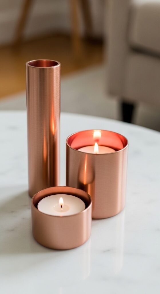 Rose gold candle holders deliver a double warmth — the warm pink-metallic tone of the metal finish and the warm amber glow of candlelight within or beside them — making them among the most atmospherically effective rose gold accents available at the lowest cost. A set of three rose gold candle holders in varying heights costs $15 to $40 from most home decor retailers and Amazon. Group them together rather than placing them individually across different surfaces — a grouped trio of rose gold candle holders creates a concentrated metallic moment that reads from across the room. Use white or cream candles only — colored candles introduce a competing tone that weakens the overall warmth of the rose gold grouping.