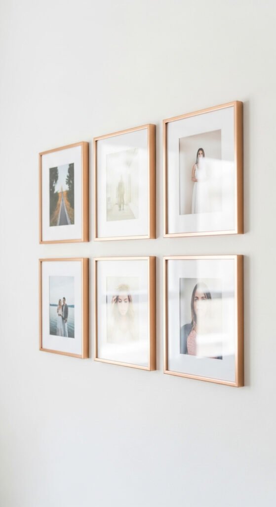 Replacing mismatched photo frames with a set of matching thin rose gold frames creates a cohesive and warm gallery wall while adding a consistent rose gold metallic tone throughout the display. IKEA’s RÖDALM frame range and similar thin metal frames from Amazon cost $5 to $12 each in rose gold. A gallery wall of five matching rose gold frames costs $25 to $60 total. The thin frame width is key — narrow rose gold frames look contemporary and refined, while thick ornate rose gold frames can look fussier than the tone deserves. Use matching rose gold frames across all sizes in a mixed-size gallery for cohesion across the arrangement.