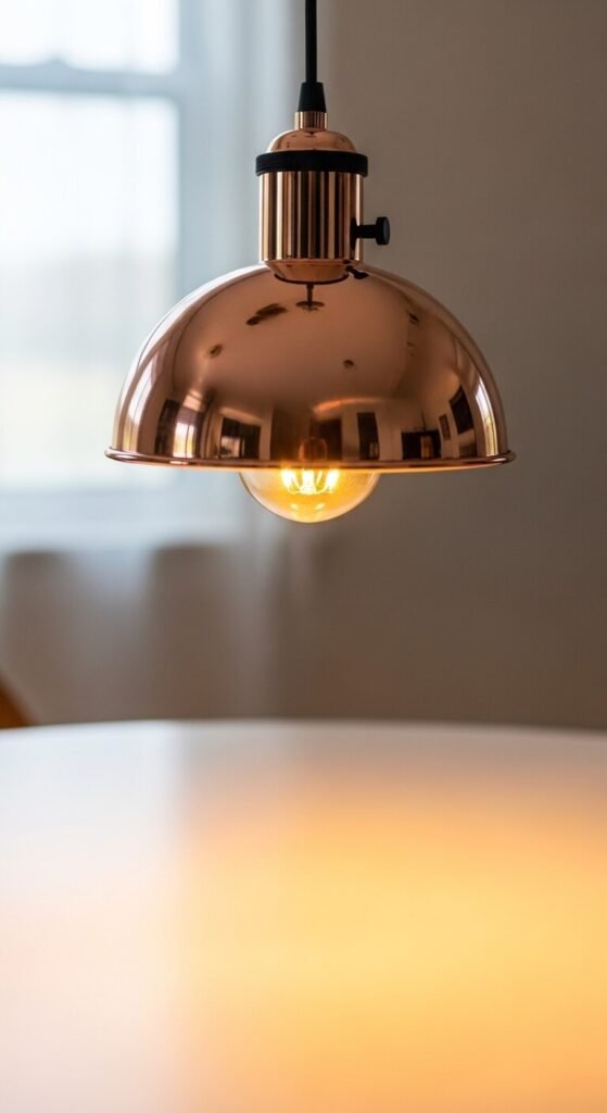 A rose gold pendant light above a dining table, kitchen island, or bedside table places the warm pink-metallic tone at ceiling height where it catches light from above and contributes a warm rose tone to the room’s ambient atmosphere. A small rose gold dome or cone pendant costs $30 to $80 from most lighting retailers and Amazon. A plug-in pendant — no electrician required — costs $25 to $60 and can be installed in 15 minutes with a ceiling hook. Use a warm white LED bulb at 2700K — the warm white bulb color interacts with the rose gold finish to produce the most flattering combined light color.