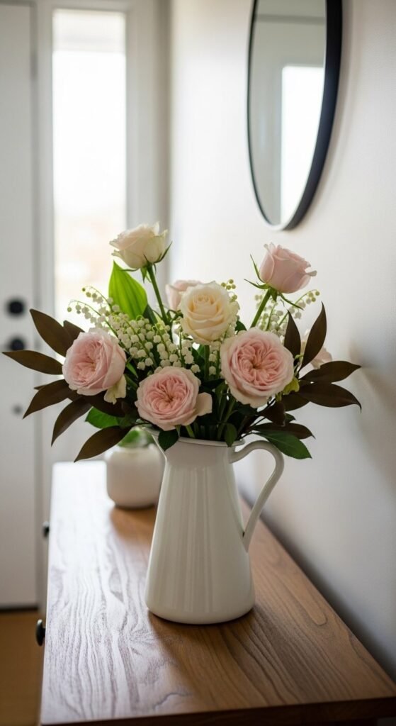 Your entry table sets the tone for the entire home the moment someone walks in — so make it count in spring. Use a ceramic pitcher, a mason jar, or any vessel you own as an impromptu vase. Fill it with a loose, garden-style arrangement of whatever is blooming at the grocery store or farmers market. Roses, ranunculus, tulips, and daffodils all work beautifully together. Pull a few stems lower than others so the arrangement looks picked, not purchased. This costs about $8 to $12 per week and makes every single entrance feel like you just walked into a garden.