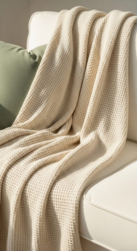 Heavy knit and fleece blankets belong in winter storage come March. A waffle-knit or linen throw in cream, white, or sage gives your sofa the lightness of the season without losing the layered, lived-in look. Waffle-knit blankets are widely available for $15 to $30 at Target, Amazon, and H&M Home. Drape it loosely over the back of a sofa or armchair rather than folding it neatly — the casual drape looks more natural. The lighter texture and weight communicate the season visually even before you process the color, which is part of what makes this swap so effective.