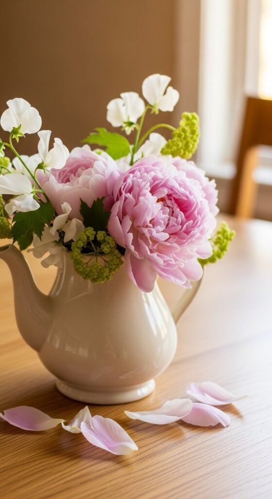 Using an unexpected vessel as a vase is one of those spring decor ideas that always gets a comment from guests. A vintage teapot, a watering can, a ceramic jug, or even a cleaned tin can works beautifully as a flower container. The imperfection of the vessel makes the flowers look more like they were gathered from a garden than bought from a store. Check thrift stores for interesting pitchers and teapots — they usually cost $2 to $5. Fill them with whatever is blooming affordably this week and swap the flowers as they fade throughout the season.