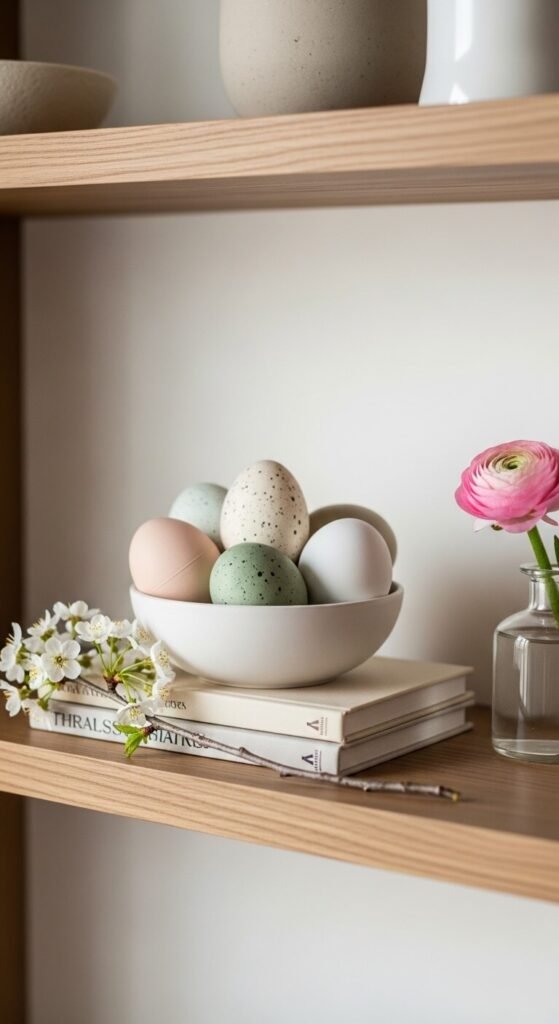16. Bring in Pastel or White Decorative Eggs for a Simple Shelf Display