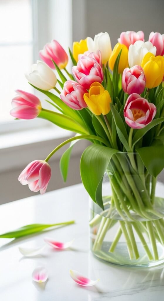 Grocery store tulips are one of the most underrated spring decor moves available. A bunch of ten tulips costs $4 to $8 at most supermarkets from February through May. Place them in a clear glass vase with clean water and cut the stems at an angle. Tulips continue to open and shift over several days, which means the display looks different — and often better — each morning. Buy one bunch per week throughout spring and rotate them between your kitchen, dining table, and entryway. This is the simplest and most reliable way to make any room feel seasonally alive.