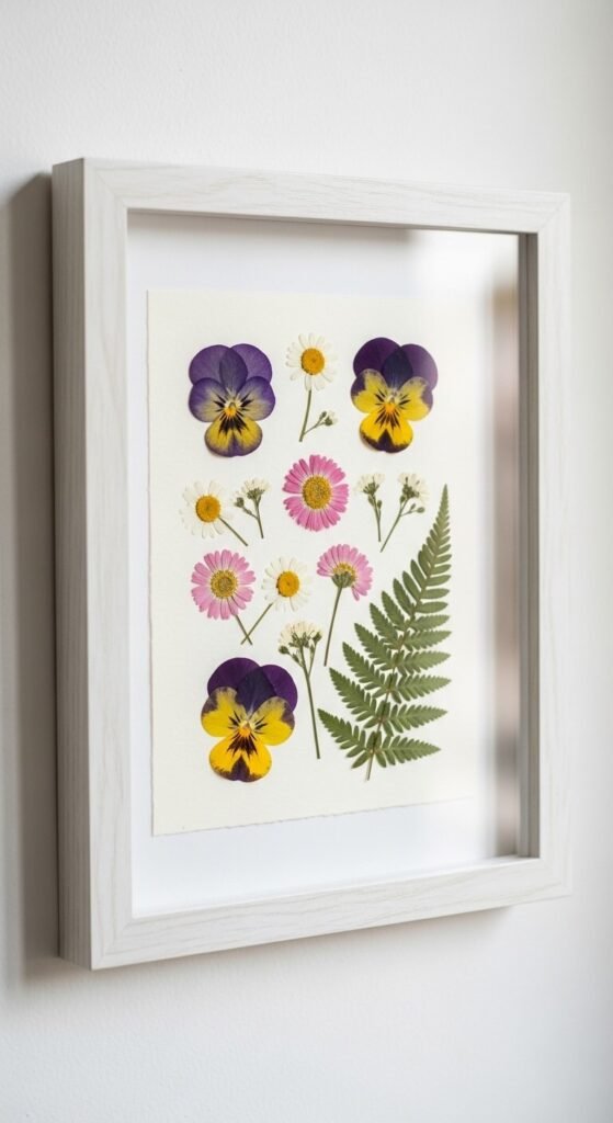Pressed flower art is genuinely one of the most beautiful and affordable things you can make for your walls. Buy a small bunch of mixed flowers from a grocery store — pansies, daisies, and chamomile press especially well. Press them flat between parchment paper and heavy books for five to seven days. Arrange them on watercolor paper or card stock and place in a frame. The whole project costs about $5 to $8 total. Make a set of three in matching frames and hang them as a gallery grouping. Each piece is completely unique and looks like something from an art boutique.