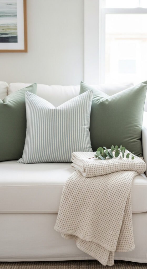 5. Add Sage Green or Soft Blue Throw Pillows to Your Sofa