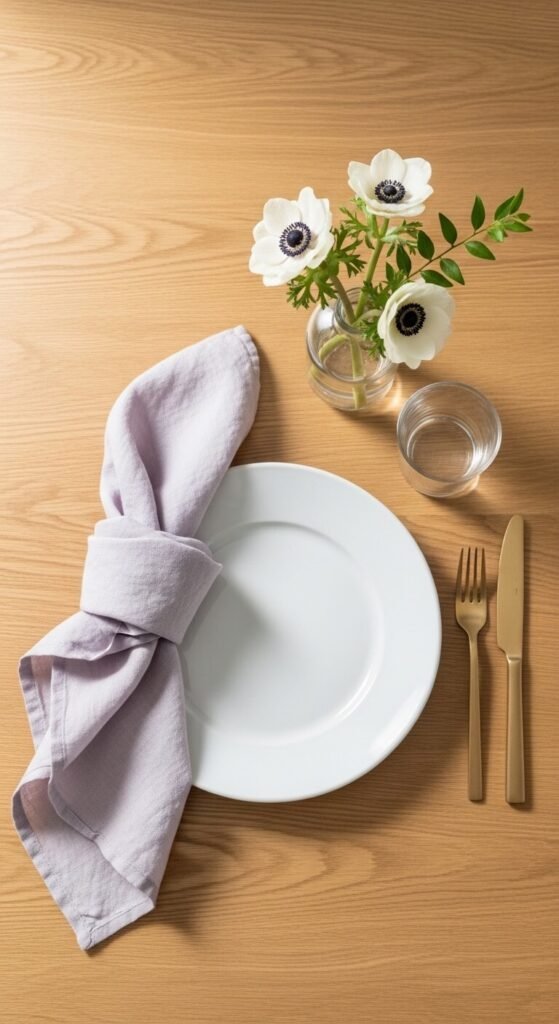 You don’t need a full table refresh to make your dining table feel spring-ready. Linen napkins in pastel tones — lavender, mint, blush, or pale yellow — replace the visual weight of winter linens immediately. Pair them with a small bud vase at each place setting holding two or three stems from a grocery store bouquet. This approach lets you use a single $6 bunch of flowers to decorate the whole table without one large centerpiece arrangement. Linen napkins from Amazon or IKEA cost about $10 to $15 for a set of four and look far more elevated than paper alternatives.