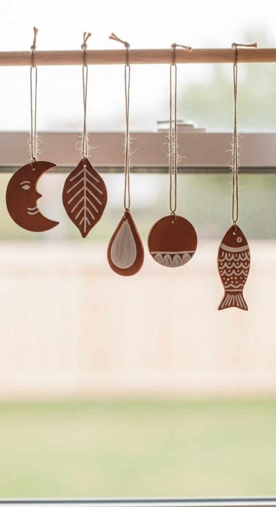 Ceramic hanging ornaments make for a charming, low-cost decorative detail. Hang a group of five to seven from a wooden dowel, a curtain rod, or a branch. Look for ornaments in terracotta with slip-painted designs — the contrast of orange clay and white patterns is graphic and striking. These work in children’s rooms, kitchens, or entryways. Many potters sell sets for $20–$40. They also make thoughtful, personal gifts. Buy a few extra to swap seasonally — it is an inexpensive way to refresh a space.