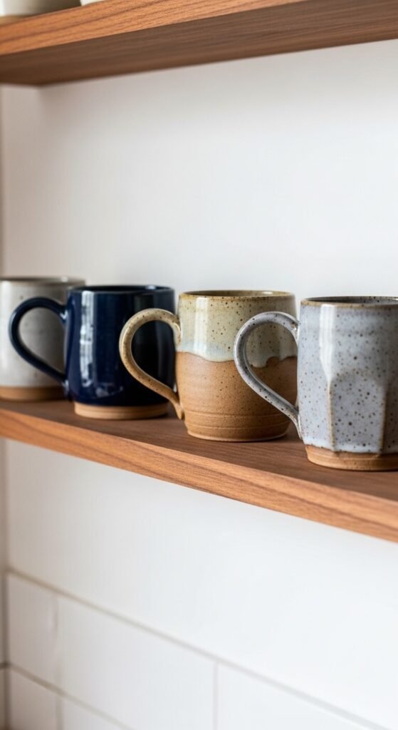 Artisan ceramic mugs are not just for drinking. A curated row of four or five on an open kitchen shelf becomes a collection worth looking at every day. Choose mugs in a loose color palette — three to four tones that go well together. The variety of handle styles, clay textures, and glaze finishes creates rhythm without chaos. Good handmade mugs cost $25–$55 each, but you can build a collection slowly. Start with one or two and add over time. The shelf display is free — no additional decor needed.