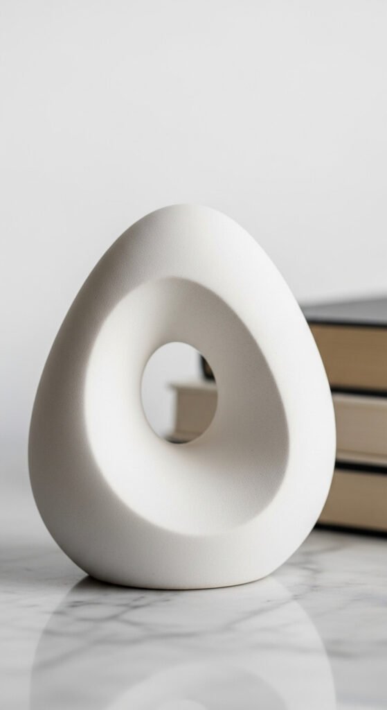 Porcelain sculptural objects — pieces made purely for visual interest rather than function — are a category worth exploring. These small forms sit on a shelf or coffee table and hold attention without doing anything at all. Look for smooth, abstract shapes in unglazed or lightly glazed white porcelain. The matte finish photographs beautifully and works with nearly any interior. Independent ceramic artists sell small sculptural pieces for $40–$100. One or two placed beside books or plants creates a gallery-like moment in an everyday room.