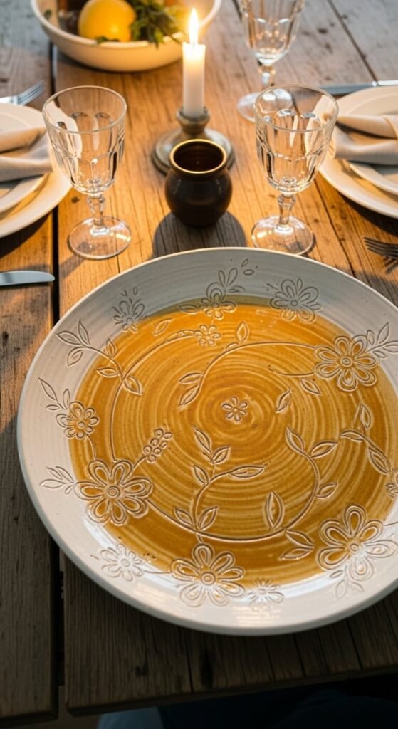 Slip-trailed ceramics feature raised lines of liquid clay applied to the surface before firing — creating a textured, almost embroidered look. Serving platters and shallow bowls made with this technique are especially beautiful on a table. The raised pattern holds the glaze differently from the flat surface, creating depth and variation. These pieces work as decor when not in use — lean a large platter against a kitchen backsplash or on an open shelf. Prices vary widely: $45–$120 for a serving-size platter from an established potter.