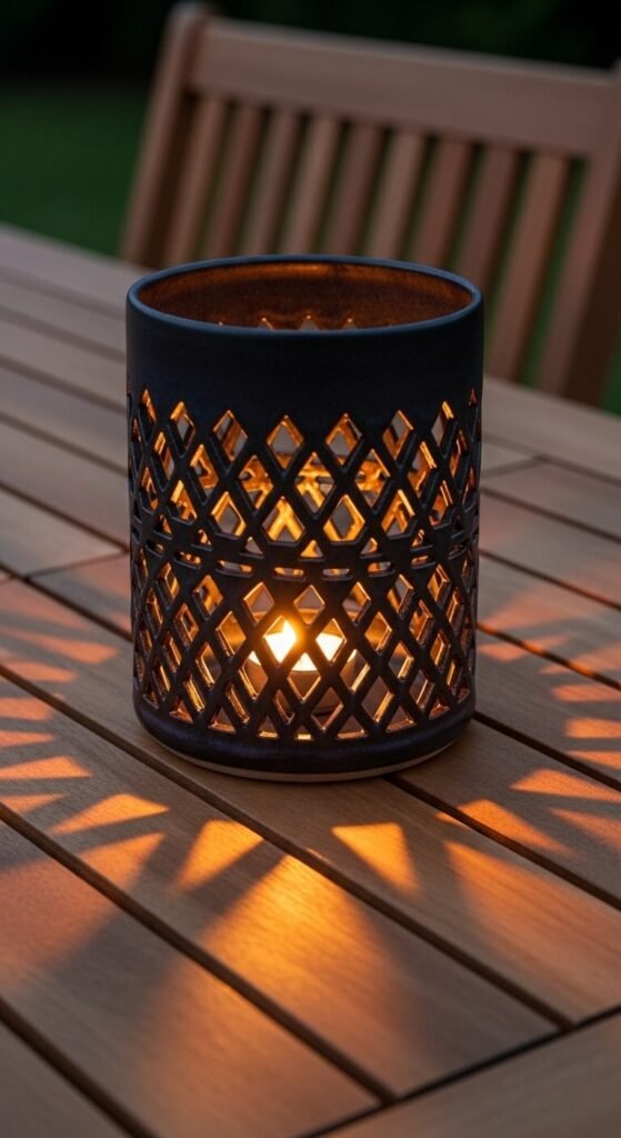 Ceramic lanterns with cut-out patterns become entirely different objects when lit. During the day they are interesting sculptural forms. At night, with a tea light inside, they cast patterned shadows across every nearby surface. Look for stoneware lanterns with geometric cut-outs — diamonds, stars, or organic leaf shapes work well. These are great for dining tables, mantelpieces, or outdoor patios. Artisan lanterns cost $40–$90 from craft vendors. The visual impact they create at night is disproportionately large compared to their size and price.