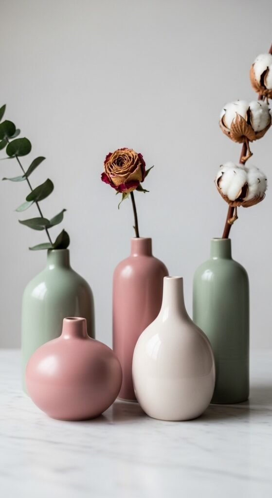 Small ceramic bud vases work best when grouped together. Pick three to five in complementary colors — think dusty rose, sage green, and off-white. They do not all need to match. In fact, slight differences in glaze or shape make the grouping look more collected and personal. Each vase can hold a single dried or fresh stem. This is a budget-friendly approach — individual bud vases often cost $10–$20 each. Arrange them on a bathroom shelf, kitchen counter, or bedroom dresser.