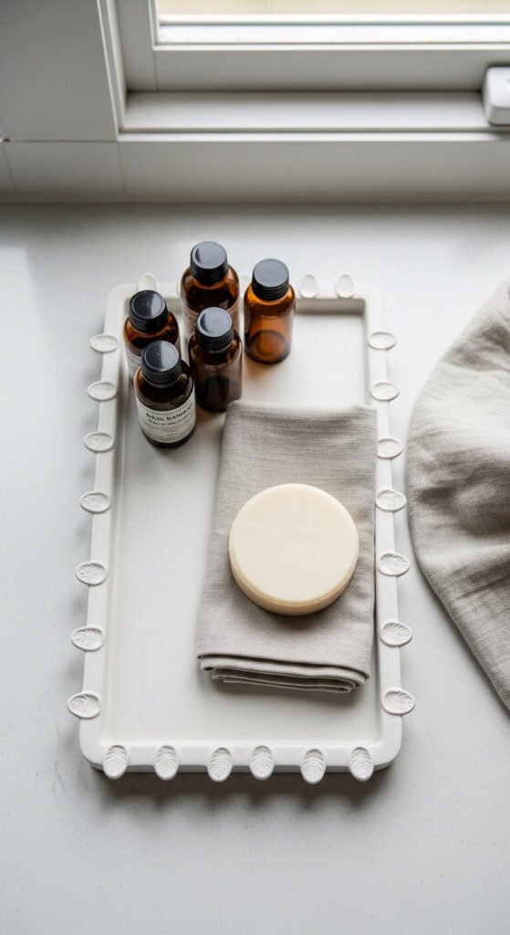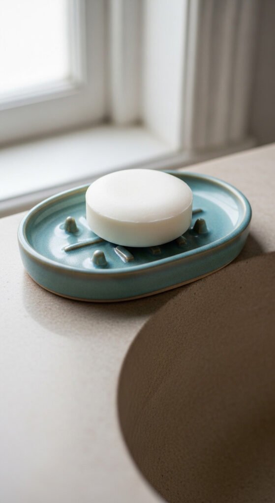 A handmade ceramic soap dish is a small upgrade that changes the feel of a bathroom instantly. Look for one with drainage ridges built into the interior — this is a functional detail that shows the potter thought about real-world use. Glazes in seafoam, warm sand, or deep cobalt work particularly well in bathroom settings. These are genuinely affordable: most cost $18–$35 from independent makers. Pair one with a ceramic toothbrush holder or small bud vase in the same glaze family to create a cohesive, curated bathroom vignette.