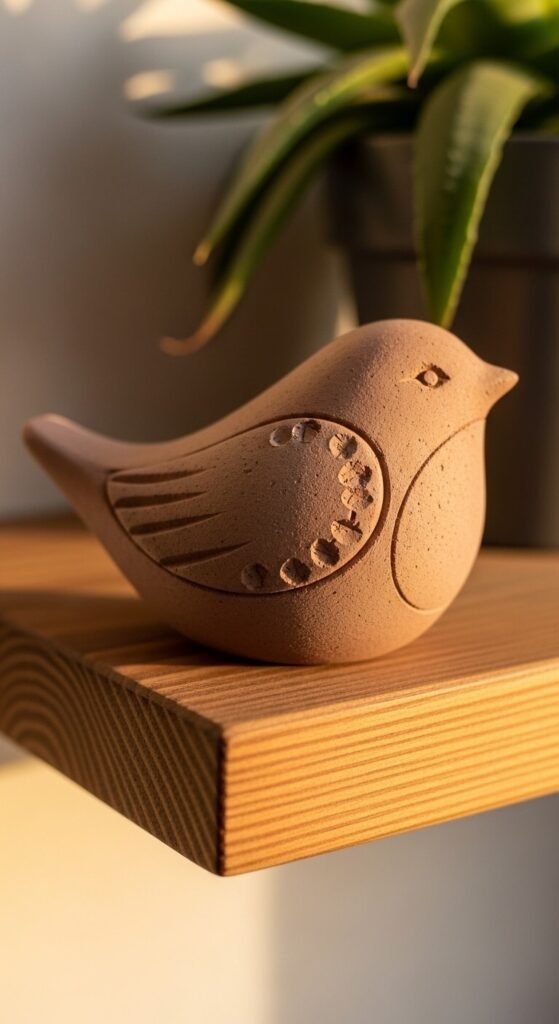 Ceramic animal figurines and small sculptural forms are among the most personal objects you can display in a home. A simple bird, a cat, a small abstract fish — these quiet objects carry a lot of character. Look for pieces where the animal form is simplified rather than hyper-realistic. Rough texture, unglazed surfaces, and carved marks give these figurines more presence than polished imitations of nature. Independent ceramic artists sell small figurines for $25–$75. Place one on a bookshelf between books, on a windowsill, or beside a plant. No further styling needed.