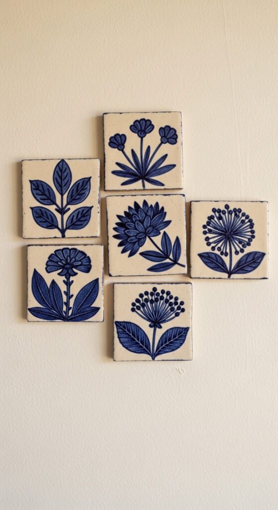 Handcrafted ceramic tiles can function as wall art when arranged in a small cluster. They do not need to cover an entire backsplash to make an impact. Buy five or six individual tiles with painted motifs — botanicals, abstract forms, or simple geometric marks work well. Mount them with small adhesive picture hangers in an intentional but loose grouping. This approach costs far less than commissioning a tile installation. Many ceramic artists sell individual tiles for $15–$35 each, making it an accessible DIY gallery wall option.