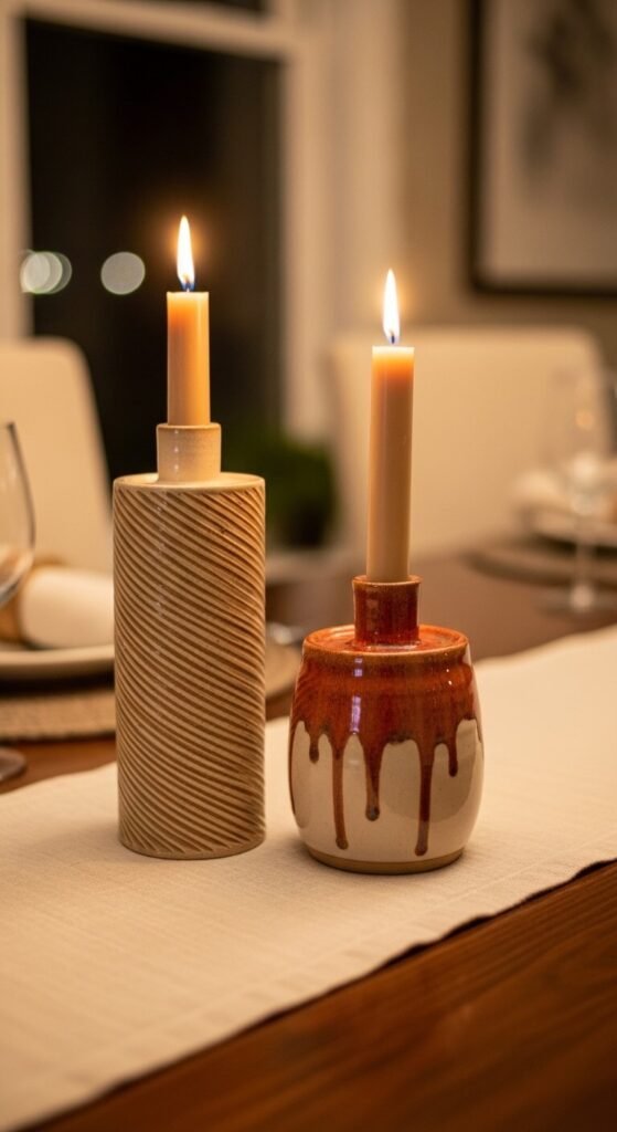 Handmade ceramic candle holders add warmth to a dining table, mantelpiece, or windowsill. The most common styles are taper holders and pillar bases. Look for ones with carved or stamped textures — these catch the candlelight beautifully. Reactive glazes in rust, ochre, or dark blue-green look especially rich when lit from within. Pairs do not need to be identical. Mixing a tall cylinder with a shorter, wider shape adds visual rhythm. Expect to pay $20–$50 per piece from independent potters.