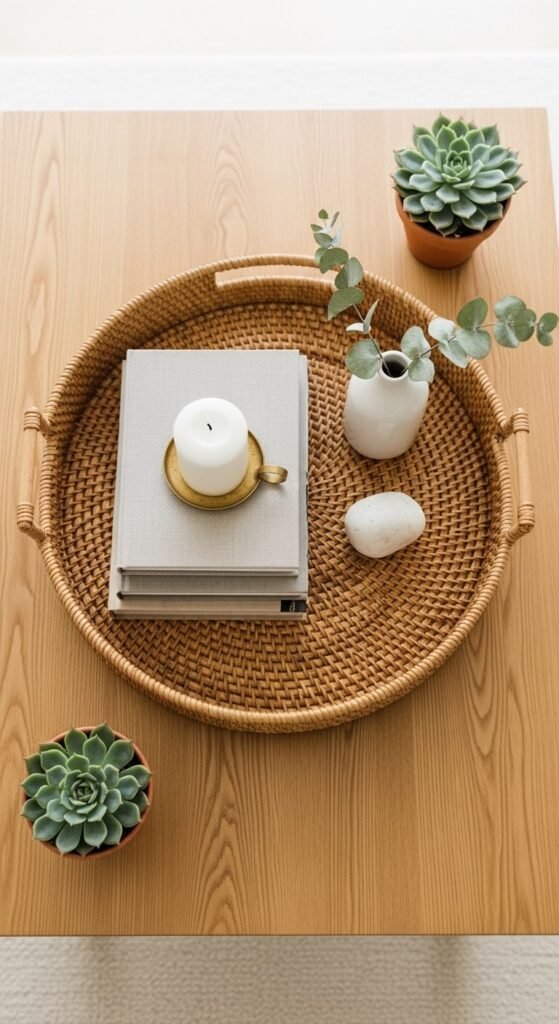 A tray is the single most useful coffee table styling tool available. It corrals loose objects into one intentional group and makes the whole arrangement look considered rather than scattered. Use a large tray — at least 12 inches across — so it reads as a proper foundation rather than a fussy detail. Round rattan, rectangular lacquered wood, and oval marble all work depending on the room’s aesthetic. Thrift stores almost always have trays for $3 to $8. Fill the tray with three to five objects in varying heights. Leave the rest of the table surface relatively clear — the tray creates the focal point, not a crowded surface.