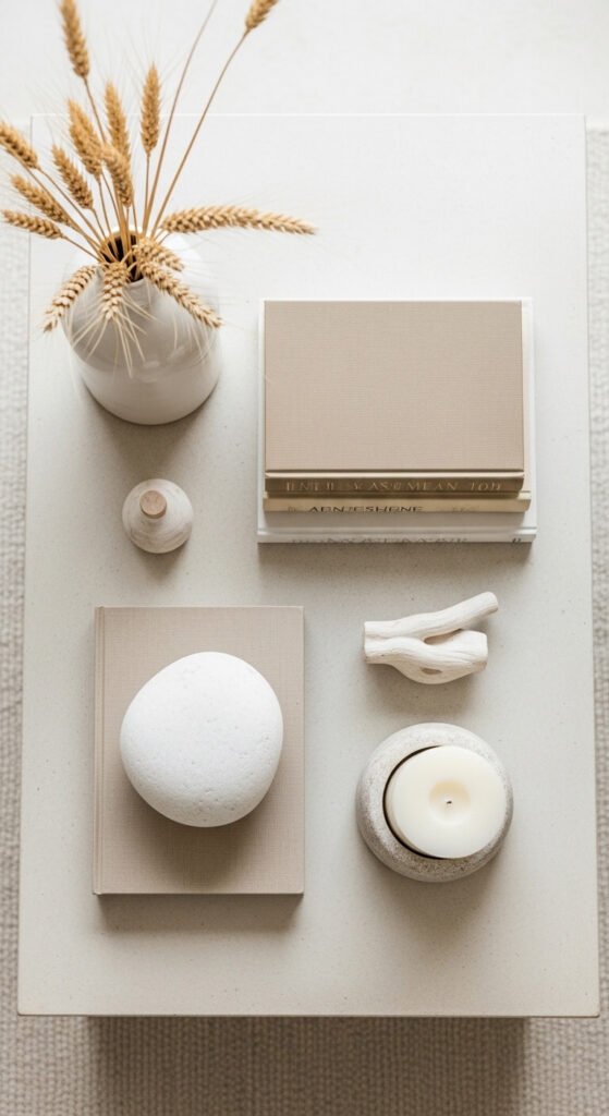 A strict neutral color palette across every object on the coffee table creates a calm, cohesive arrangement that photographs beautifully and suits almost every room style. White, cream, sand, warm grey, and bleached wood all sit within the same tonal family and never clash. The interest comes from varying textures — smooth ceramic beside rough stone beside woven rattan beside matte linen-covered books. This approach works especially well in open-plan rooms where the coffee table is visible from multiple angles. Neutral objects are the easiest to source cheaply from thrift stores — plain white and cream ceramics are the most commonly donated category in most charity shops.