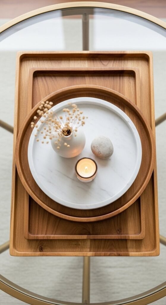 Nesting a smaller tray inside a larger one creates a layered, architectural feel that a single tray cannot achieve alone. Use contrasting materials — a raw wood outer tray with a marble inner tray, or a rattan base with a lacquered inner tray — so the two layers read as distinct elements. Keep the outer tray empty or nearly so, letting the inner tray hold all the styled objects. This approach suits larger coffee tables where a single tray looks undersized. Both trays can be sourced secondhand for $3 to $10 each. The layered effect reads as designed and considered even though the actual technique is simple.