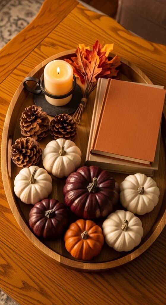 Seasonal coffee table styling is one of the simplest ways to keep a living room feeling alive and current through the year. For autumn, build around a tray of small decorative pumpkins in white, cream, and deep burgundy tones — more sophisticated than all-orange. Add a short pillar candle, two or three pinecones, a small bunch of dried autumn leaves, and a linen-toned book stack. Small decorative pumpkins cost $1 to $4 each at farm stands and grocery stores from September onward. Pinecones are free from any woodland walk. The entire seasonal display costs under $15 to build and transforms the room’s atmosphere completely within minutes.