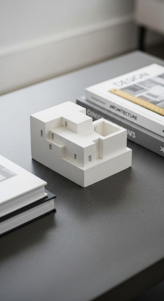 Small architectural models, geometric building forms, or abstract structural sculptures bring a design-forward quality to a coffee table display. Use a white plaster, resin, or marble miniature architectural piece — a scaled building fragment, a column capital, or an abstract geometric form — as the primary object. Pair it with architecture or design books and one or two precision objects: a brass ruler, a drafting compass, or a small technical instrument. Plaster architectural models and resin building fragments are available from design stores and online for $15 to $40. This aesthetic suits modern, industrial, and Scandinavian interiors particularly well and signals a genuine interest in design.