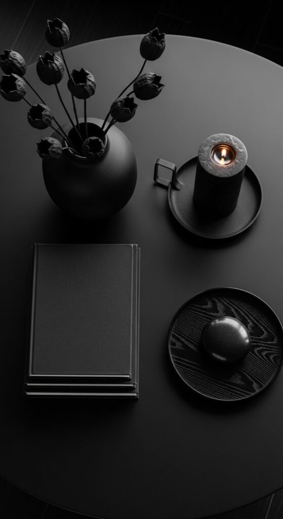 An all-black coffee table display is one of the most dramatic and design-forward arrangements possible. Group black ceramic, black iron, black lacquer, and matte black objects together — the interest comes from the subtle texture differences between each finish rather than color variation. A matte black vase, a black pillar candle, a black lacquered tray, and three books with dark covers all work together. Spray paint transforms any object into a black-toned accent for $4 a can. This arrangement suits modern, industrial, and contemporary minimalist rooms and photographs with extraordinary graphic impact. Keep the surrounding room relatively pale to let the black table display read clearly.