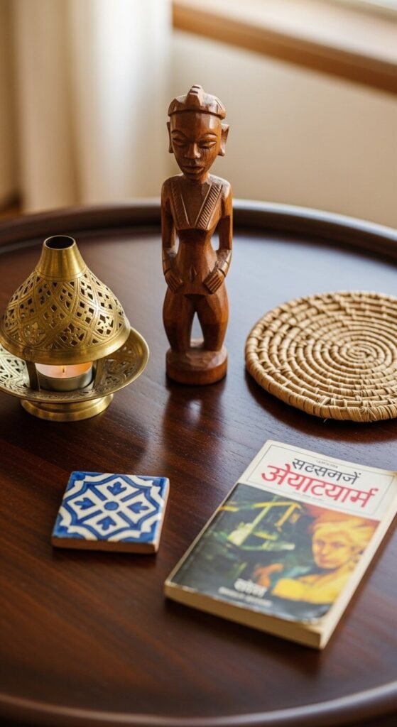 Personal travel objects arranged thoughtfully on a coffee table tell a more interesting story than any purchased decorative set. Select five to eight objects from meaningful trips — a small carved piece, a brass object, a ceramic tile, a woven item, a foreign postcard or book. The objects should be small enough to sit on the table without crowding it and interesting enough to prompt a question from a visitor. Space them with generous negative space between each piece. This costs nothing because you already own the objects — it is a curation and arrangement exercise. Rotate which pieces are displayed to keep the table feeling current.
