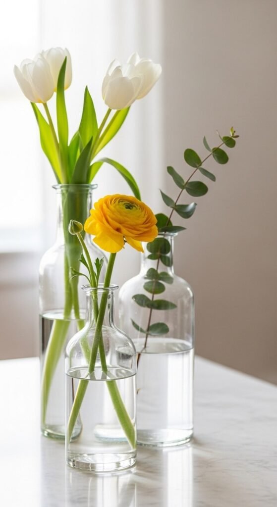 Clear glass vases grouped together with simple single-flower arrangements are one of the most reliably elegant coffee table styling choices. Use three vases in different heights — the variation in scale creates the visual interest. Fill each with a single flower type rather than mixed arrangements — one vase of tulips, one of ranunculus, one stem of eucalyptus. The clear glass shows the stems, which adds another layer of visual interest. Supermarket flowers cost $3 to $8 a bunch. One bunch typically fills all three vases. Clear glass bud vases and bottles from a thrift store cost $0.50 to $2 each. Replace flowers weekly.