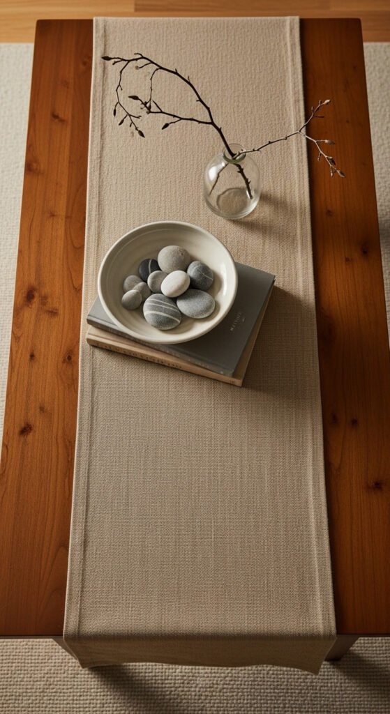 A folded linen napkin or fabric runner laid under a coffee table arrangement adds warmth and texture to a hard table surface and grounds the objects above it. Use a folded linen napkin, a small textile remnant, or a thin fabric table runner in a neutral tone that suits the room’s palette. This technique is particularly effective on glass, marble, or polished wood tables where objects can look stark against a hard reflective surface. Linen fabric remnants from fabric stores cost $2 to $5 for a small piece. The textile layer makes the whole arrangement feel warmer and more considered without adding any height or visual noise.