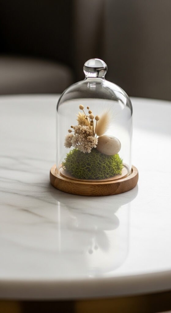 A glass cloche or small terrarium brings a collector’s display quality to a coffee table arrangement. Place a small curated arrangement under the cloche — a preserved moss mound with one dried flower, a tiny sculpture, a smooth stone, or a single mineral specimen. The glass dome frames the interior arrangement like a tiny museum exhibit and draws the eye immediately. Glass cloches cost $10 to $25 from craft stores or online. Use a small circular wood disc or marble tile as the base. This is one of the most photographable coffee table elements available — the glass creates natural focus and magnification that draws both the eye and the camera lens.