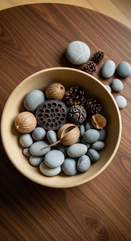 A wide, shallow bowl filled with natural objects is one of the most genuinely cost-free coffee table arrangements you can make. Collect smooth river stones, dried seed pods, small pinecones, sea glass, or acorns and fill a beautiful ceramic or wooden bowl. The contents should be curated — a single category of natural object or two complementary types — rather than a random mix of whatever is at hand. The bowl itself is the only purchase necessary. A beautiful wide ceramic bowl from a thrift store costs $2 to $8. The contents are free. This arrangement suits organic, Scandinavian, wabi-sabi, and naturalistic interior styles and requires zero ongoing maintenance.