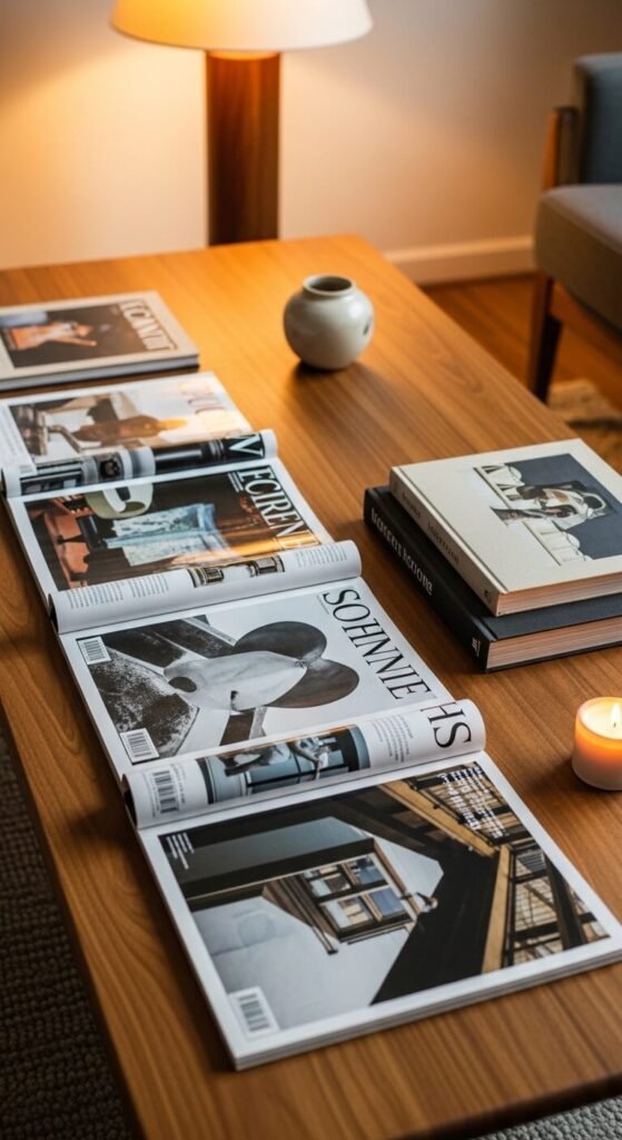 A deliberate arrangement of magazines and books on a coffee table signals that the space is used for reading and thinking — a living, functional arrangement rather than a purely decorative one. Fan large format magazines slightly in an overlapping arrangement rather than stacking them in a neat pile. Mix with one or two hardcover books in complementary cover tones. Remove any magazines with loud, cluttered covers — keep those that have clean photographic or illustrated covers. This approach costs nothing using magazines you already own and updates naturally each time new issues arrive. Rotate older issues into a basket below the table to keep the surface current.