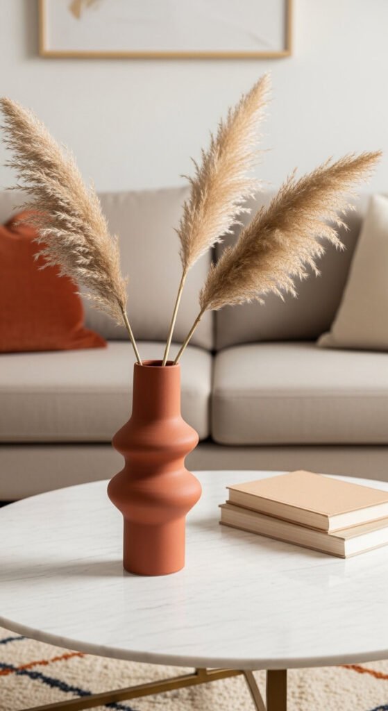 One strong vase with the right contents makes a bigger statement than a cluster of five mediocre objects. Choose a vase with a distinctive silhouette — a wide-mouthed ceramic, a tall bottle-neck form, or an angular sculptural shape — and fill it with a single type of dried botanical. Pampas grass, dried allium, tall dried grasses, or a few twisted bare branches all work beautifully. Dried botanicals last for months without any care. A bag of dried pampas grass costs $8 to $15 online. The vase itself is the long-term investment — buy one you genuinely love in a form and color that suits the room.
