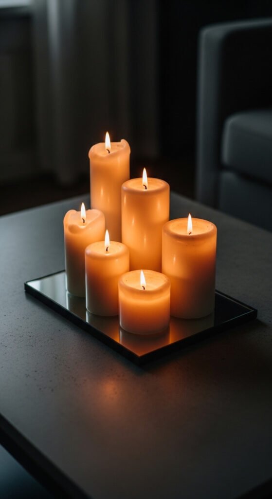 A cluster of pillar candles grouped on a small tray is one of the most atmospheric coffee table arrangements for evening use. Use five to seven candles in different heights and diameters — all in the same color family, either all white, all ivory, or all in warm earth tones. The variation in height creates visual interest; the color unity holds the cluster together. Place them on a mirrored, marble, or metal tray to protect the table surface and reflect the light. Pillar candles in bulk from discount stores or dollar stores cost $1 to $4 each. Swap in battery-operated flameless versions for safety in homes with children or pets.