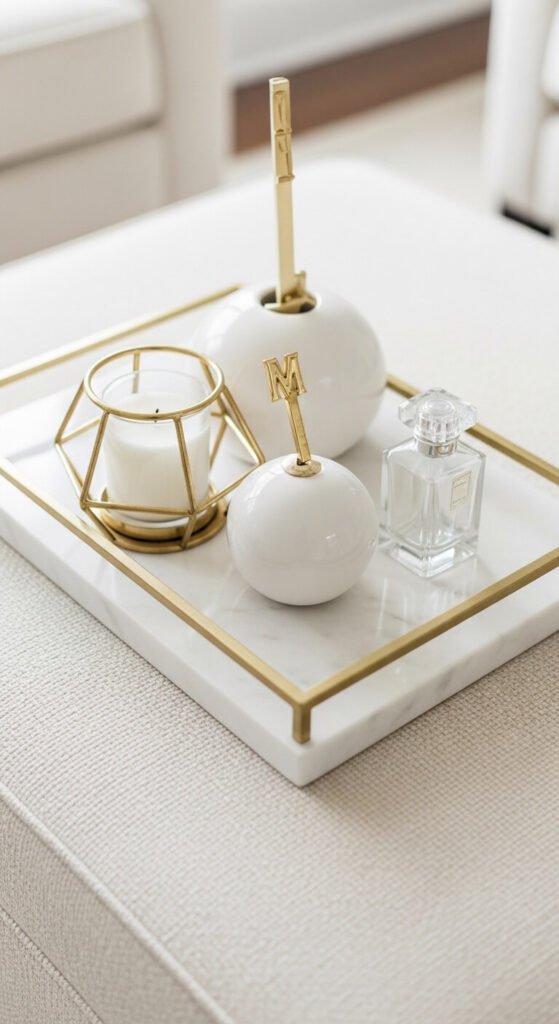 A marble tray with gold hardware reads as expensive and considered even when the objects inside cost very little. Use the tray as the star of the arrangement and keep the objects inside simple: a gold candle holder, a white ceramic sphere, and one small reflective object — a crystal, a small brass piece, or a simple perfume bottle. The material contrast between marble, gold, and white creates visual richness without any single expensive purchase. Marble look resin trays cost $15 to $35 online. Combine with objects from thrift stores finished in gold spray paint — a $4 can transforms almost any metal or ceramic object into a gold-toned accent.