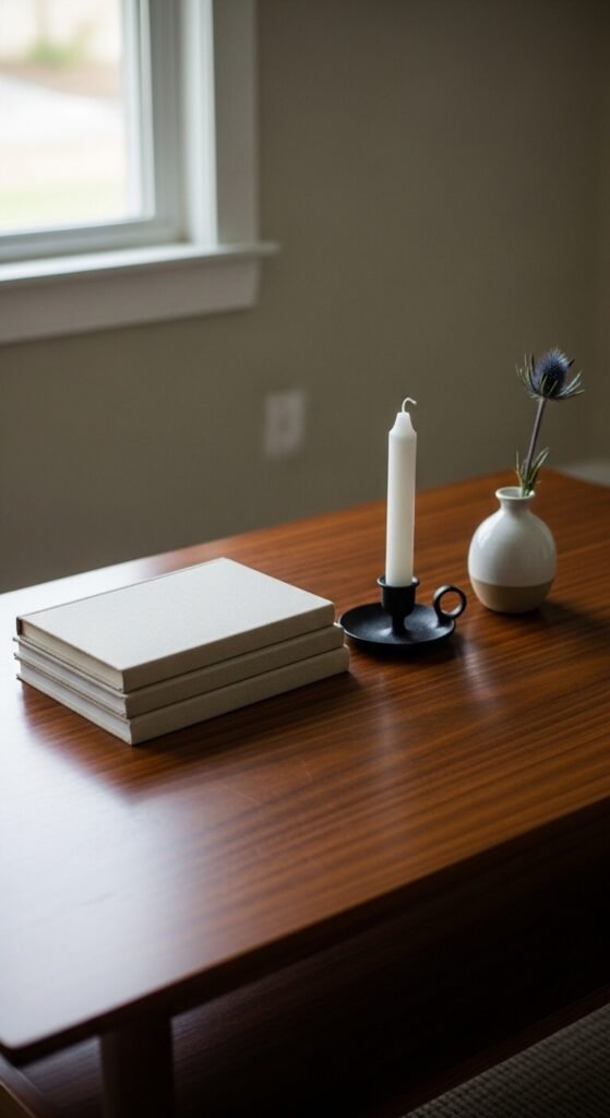 Stacked books are the foundation layer of almost every well-styled coffee table. Use large format hardcover books — art, architecture, travel, or photography — and remove dust jackets to reveal the plain cloth covers underneath, which are almost always more visually appealing. Stack two to three books and place a small object on top: a ceramic piece, a candle, or a smooth stone. Thrift stores are the best source — large format hardcovers cost $1 to $4 each and the visual quality is identical to full-price versions. Aim for spines in tones that relate to your room’s color palette. The books function as both decor and a natural riser for other objects.