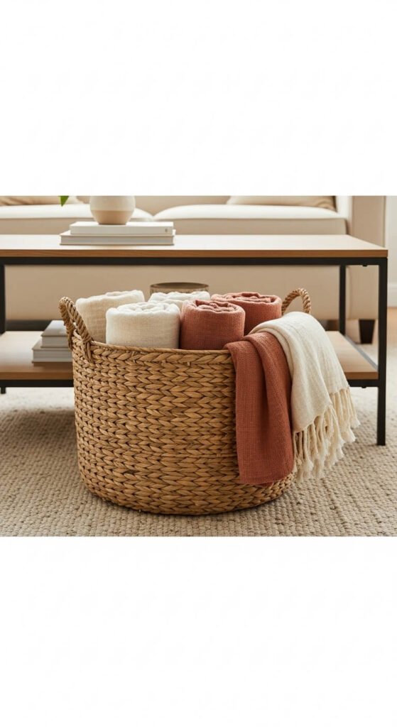 A woven basket on the lower shelf or beside a coffee table adds texture, warmth, and genuine storage utility. Use it to hold folded throw blankets, rolled magazines, or extra candles — functional objects that look good when partially visible. A large round seagrass or rattan basket costs $15 to $35. The basket itself becomes a textural decor element while doing a practical job. On a two-tier coffee table, place the basket on the lower shelf and keep the upper surface styled with three to five smaller objects. In a room with children, this approach keeps toys and remotes corralled and out of sight while still looking intentional.
